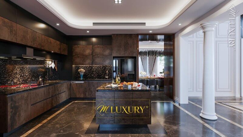 Phòng bếp được thiết kế theo phong cách tân cổ điển, với hệ thống tủ bếp chữ L được làm bằng gỗ óc chó tự nhiên, kết hợp với mặt đá nhân tạo cao cấp để phù hợp với nhà phố, biệt thự.