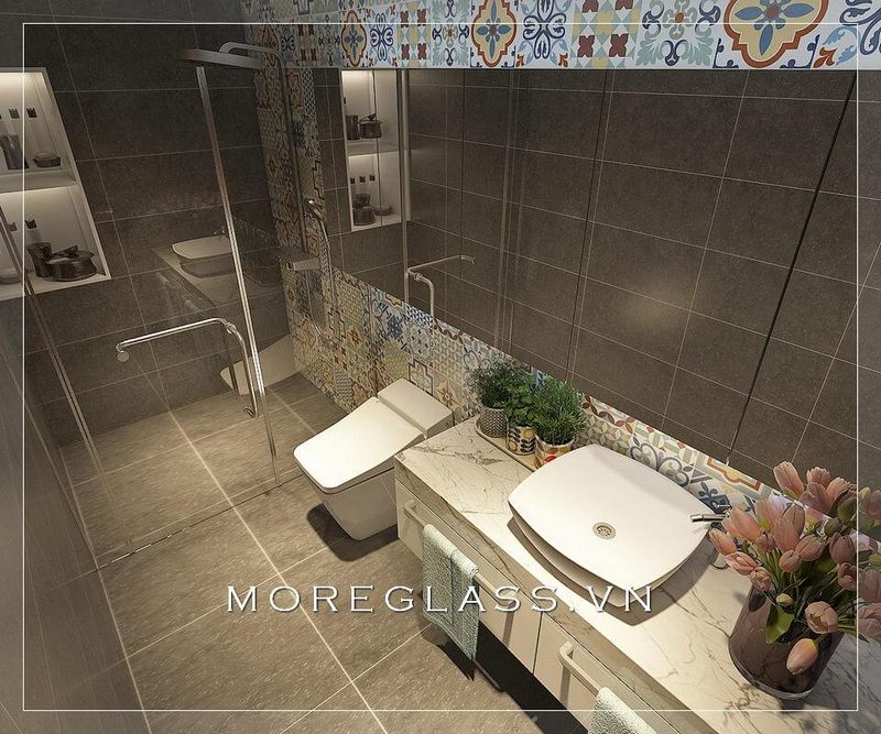 Mẫu thiết kế phòng tắm kính hiện đại ở góc trong cùng giúp tách biệt và phân chia khu vực tắm và vệ sinh, nội thất của phòng tắm được thiết kế theo phong cách hiện đại.