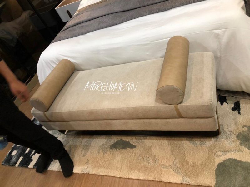 Mẫu đôn sofa cuối giường bằng khung gỗ tự nhiên bọc nỉ cao cấp màu be cho phòng ngủ thêm sang trọng